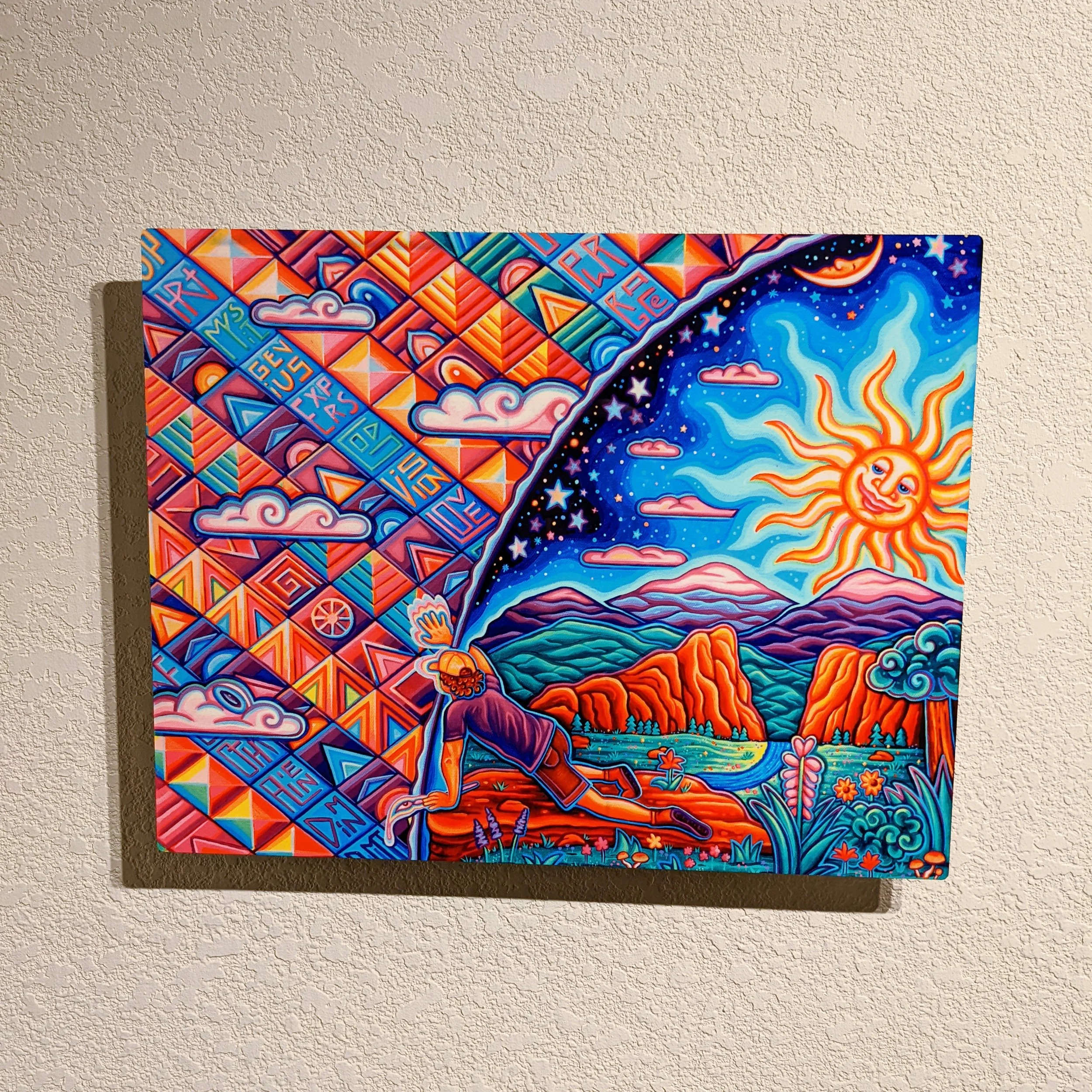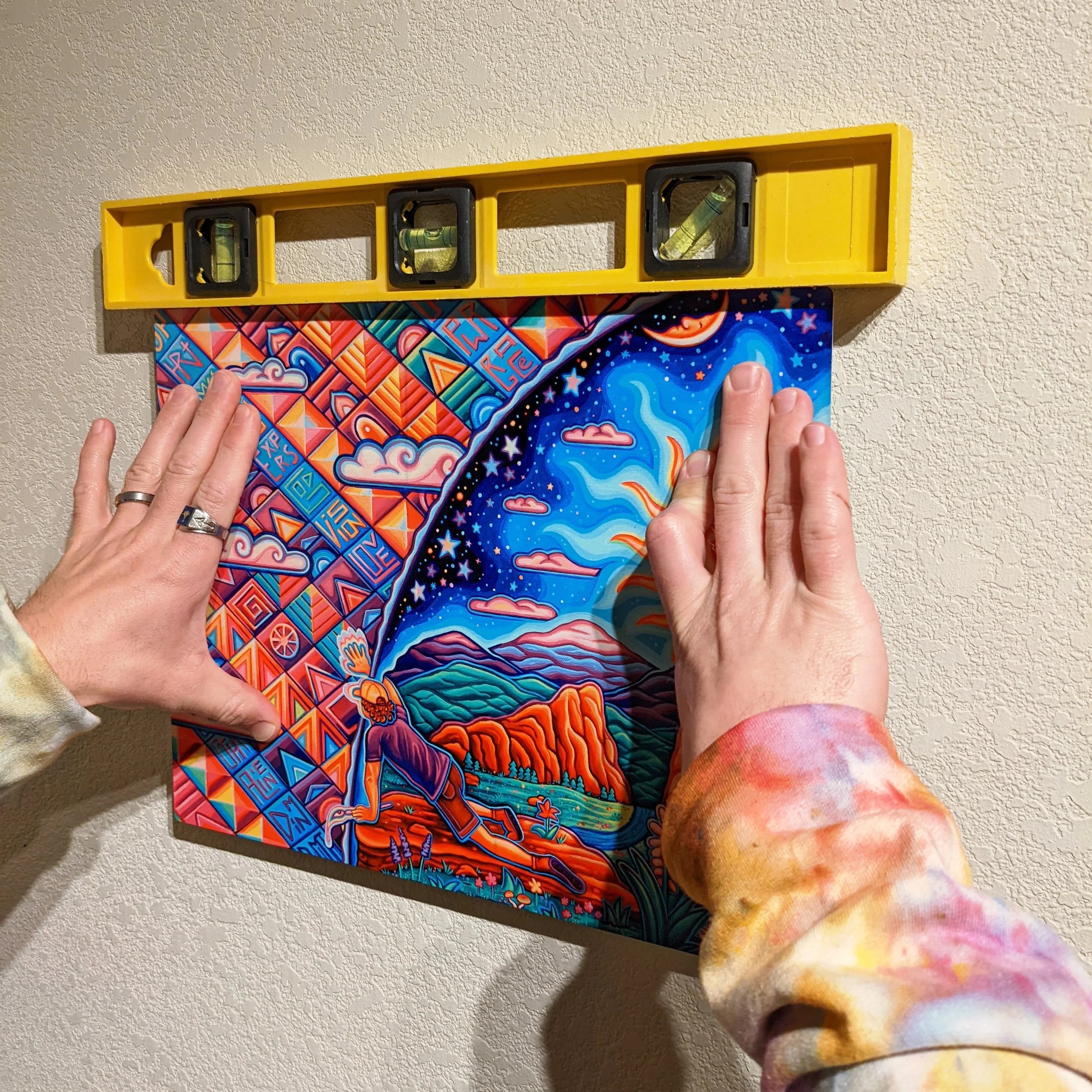 1. Hold the print against the wall where you want it to hang. Use a level to make sure it’s straight. Then apply pressure to the front of the print to leave 4 indents in the wall.